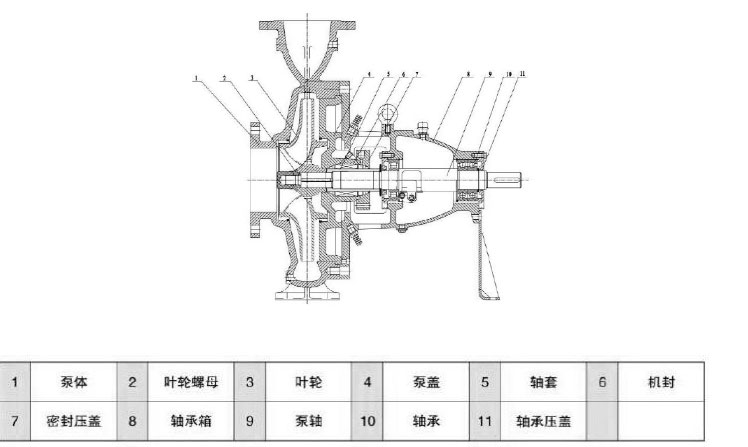 1、臥式后開門結構,泵頭與電機采用聯軸器連接,安裝在底板上,葉輪為后開式,三只軸承,軸封采用外裝式機械密封,設有冷卻裝置,軸承體的油位用油鏡觀察;結構緊湊合理。